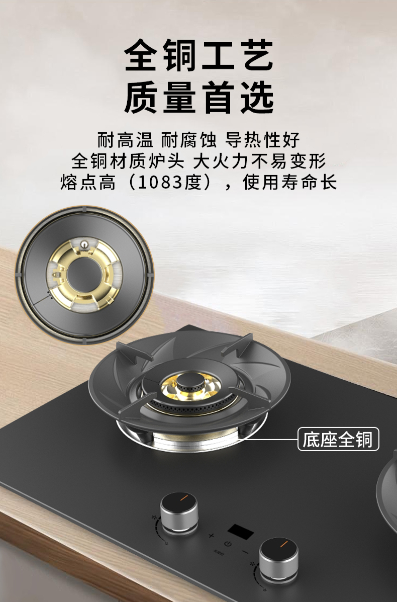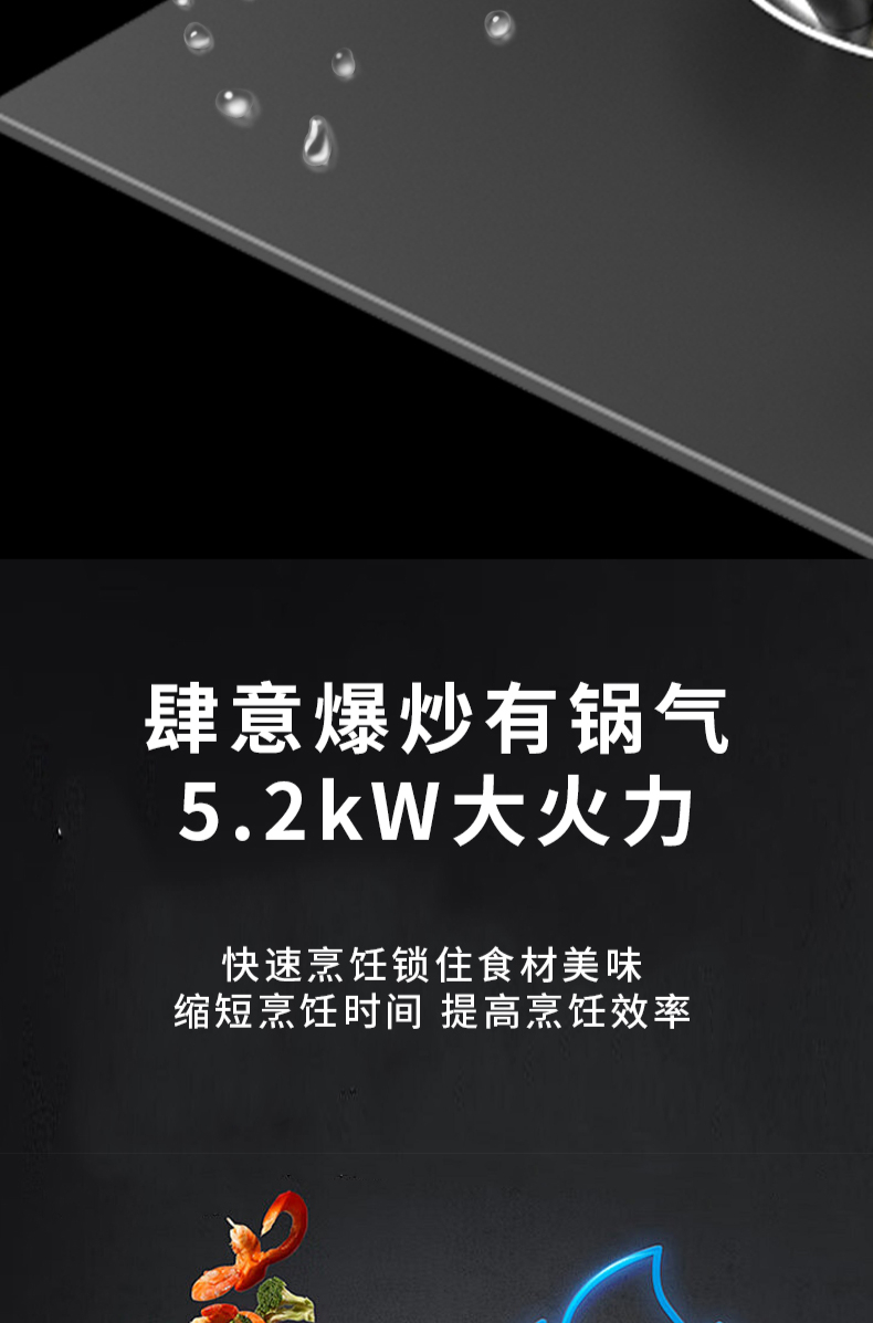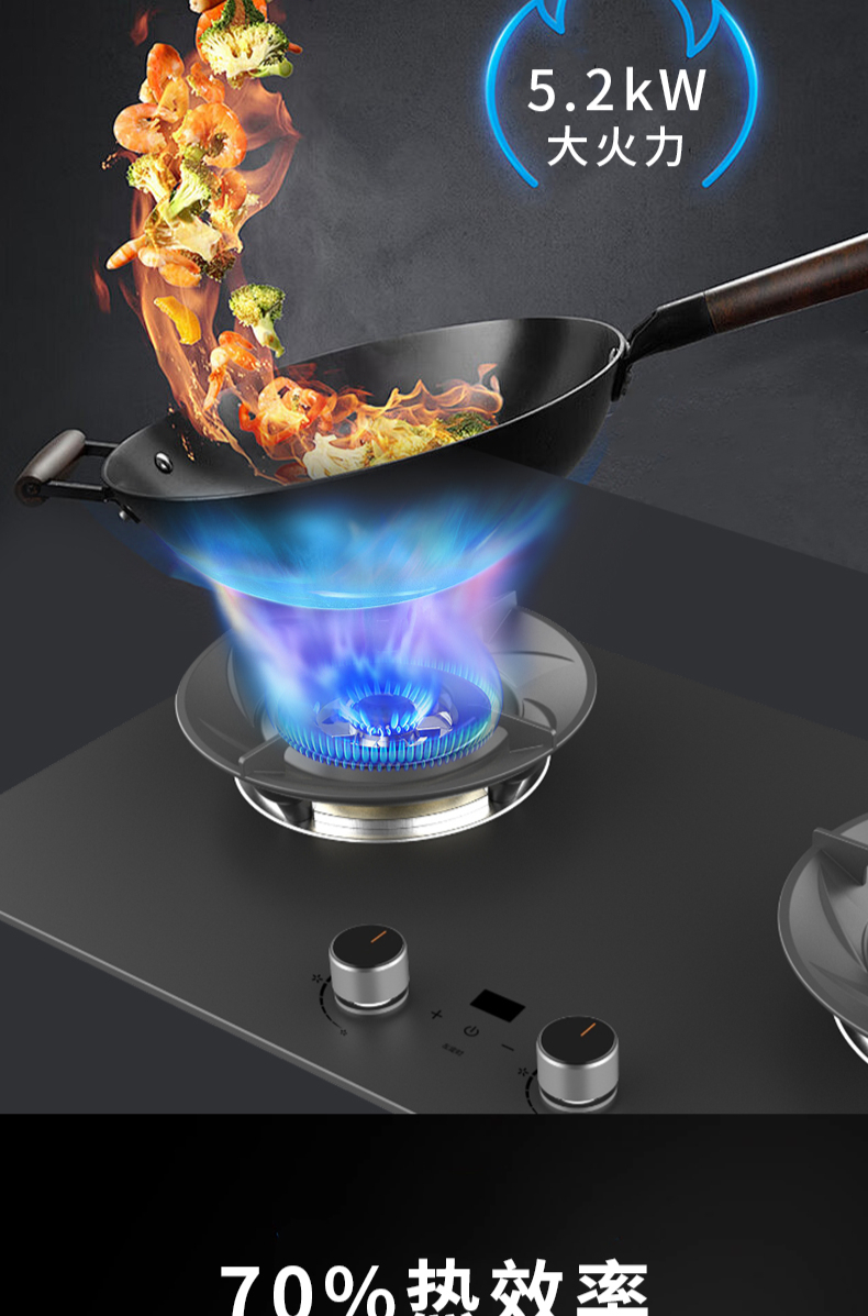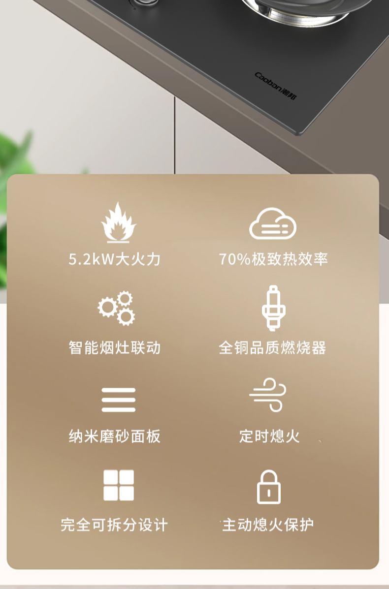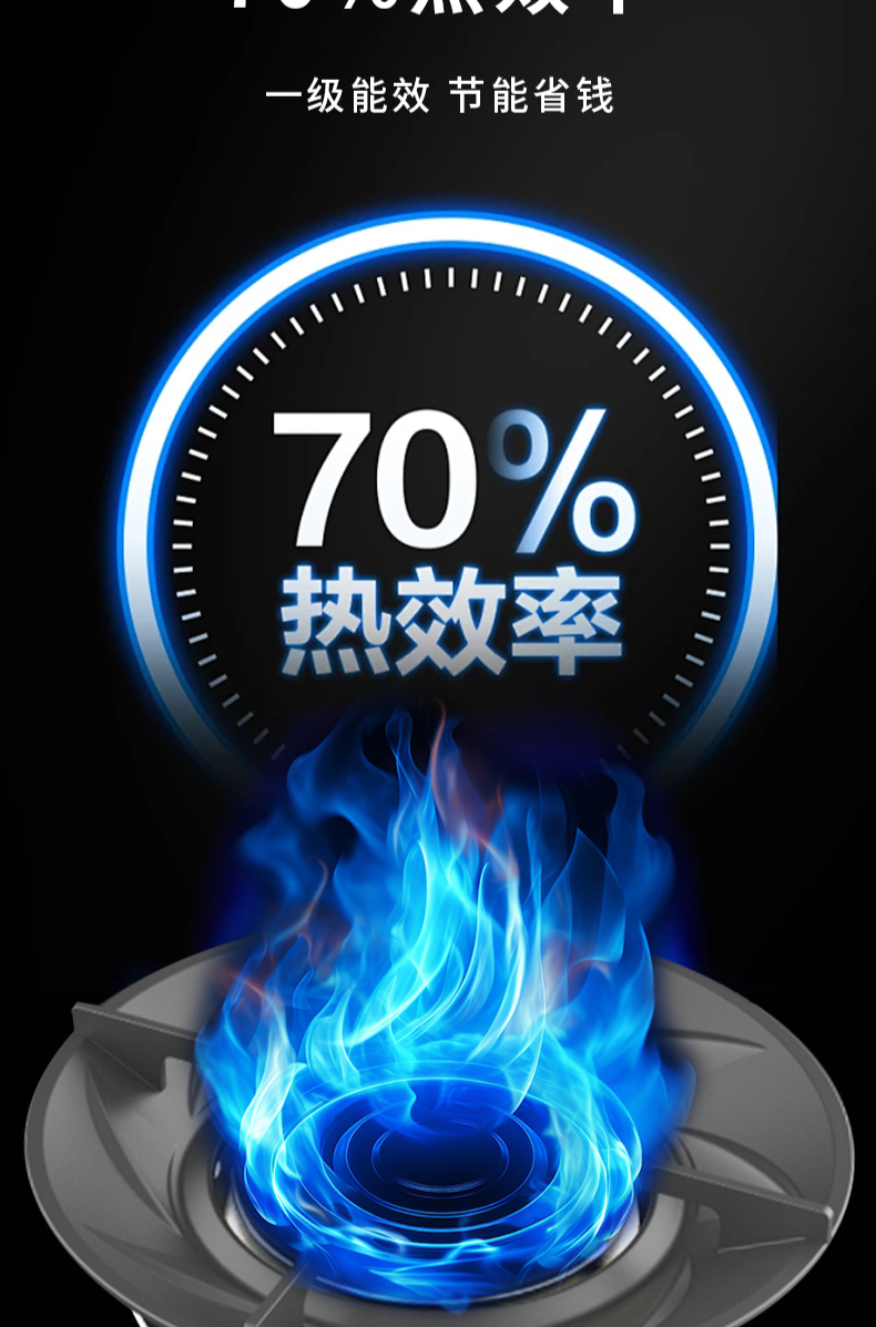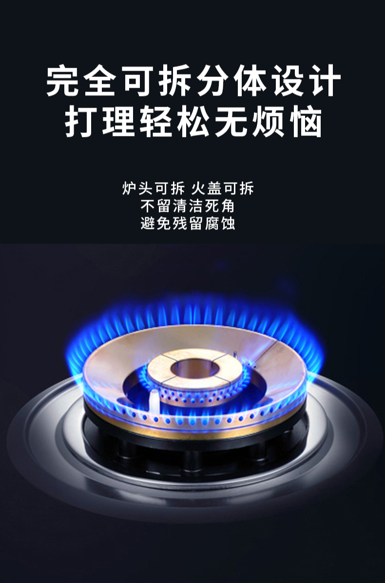 大火力,70%熱效率;智能煙灶聯動;全銅燃燒器;完全可拆分設計;主動熄火保護;